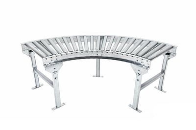 - Guard rails: Side rails prevent items from falling off during transit, protecting products and personnel. These can be added to both straight and curved sections to keep items moving safely throughout the warehouse.